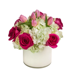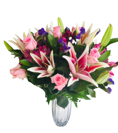 Brighten their day with this cheerful arrangement of stargazer lilies, roses and some greenery. This thoughtful bundle is delivered by a local florist in a clear glass fluted vase . Same day delivery available