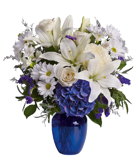 Send a peaceful floral arrangement that is beautiful as a blue sky. Arranged with white lilies, white roses, white daisies and blue hydrangeas. A perfect white and blue flower arrangement that is an ideal gift for a variety of occasions.