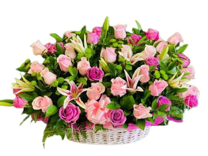 Mixed of Roses and stargazer lilies are celebrated superbly in all their vibrant beauty in this gleaming bouquet arranged in a white basket.